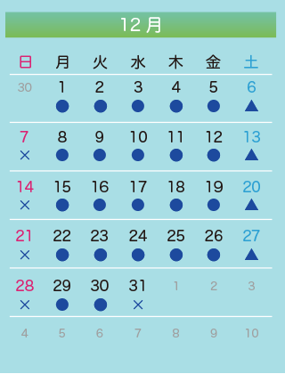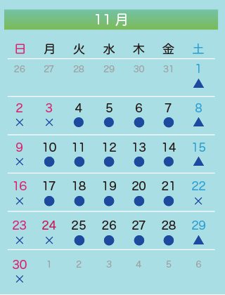 11月22日(土)は休診いたします。 11月19日と12月17日の第三水曜日は通常通り診療いたします。 12月31日(水)から1月4日(日)は年末年始の休診期間です。